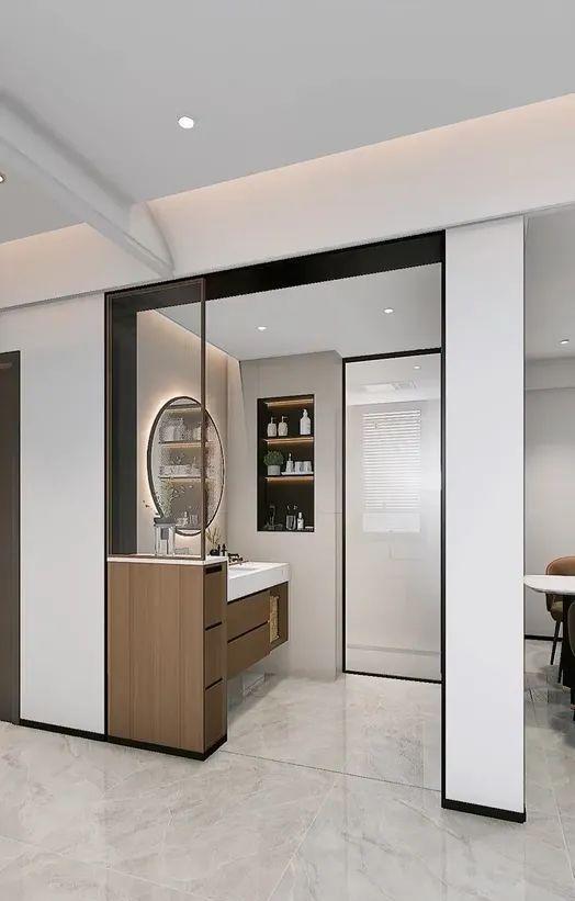 接着打造半高抽拉柜,各种瓶瓶罐罐能分类存放,台面铺设大理石,不仅质感十足还扩充了置物区域,再安装玻璃隔断,保证空间通透不遮光。