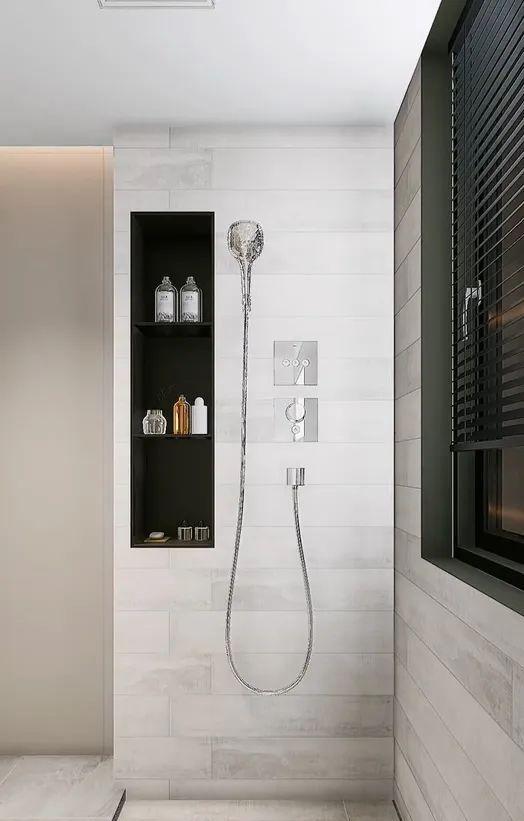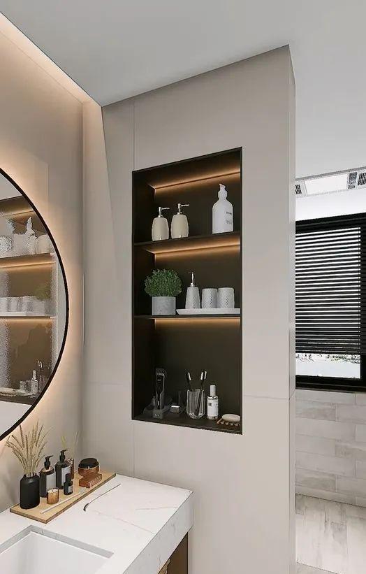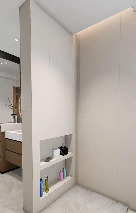 侧边砌墙并开凿孔洞,嵌入金属壁龛,方便放置杯子牙刷,里侧也设置壁龛,可供随手放置手机纸巾。