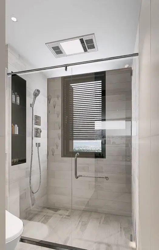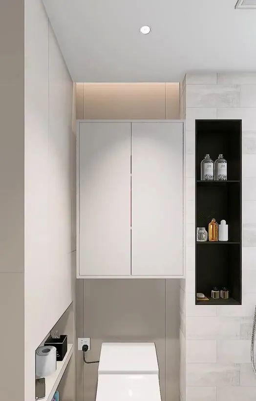 淋浴区包管构建壁龛,让沐浴用品有了专属收纳之处。中间安置智能马桶,集便利、卫生与节水优势于一体,上方打造组壁柜,充分利用空间。