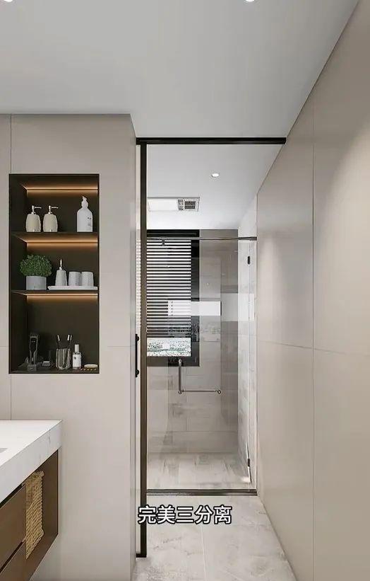 最后安装淋浴隔断,中间装上吊柜门,成功实现完美的三分离布局,使卫生间功能分区明确,整洁有序,极大提升了使用的舒适度与便捷性。