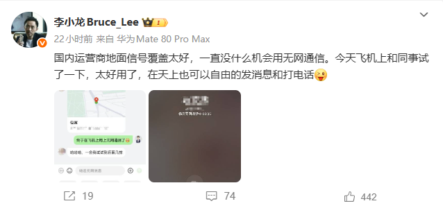 2025年12月8日,华为终端BG CTO李小龙发布博文称,他使用的华为Mate 80 Pro Max无网通信功能可在飞机上自由发消息或打电话。