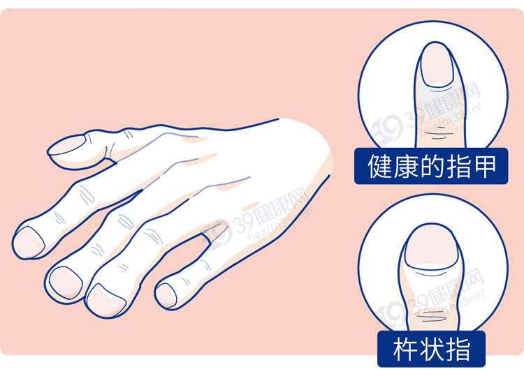 杵状指是指手指末端指节,尤其是骨面软组织出现无痛增生、肥厚以及肿胀,让手指末端异常嘭起的表现。出现杵状指的患者中,约有75~80%与肺癌相关。因肺部组织病变会让气道受阻,从而让身体缺氧,离心脏较远的手指末端就会出现组织异常增厚。
