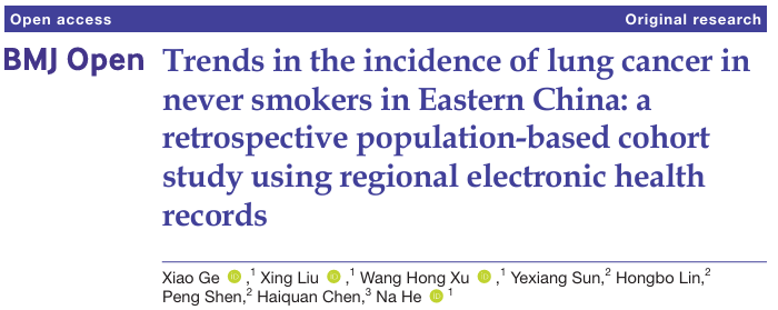 [4] Ge X, Liu X, Xu WH, et al. Trends in the incidence of lung cancer in never smokers in Eastern China: a retrospective population- based cohort study using regional electronic health records. BMJ Open 2025;15:e104941. doi:10.1136/ bmjopen-2025-104941