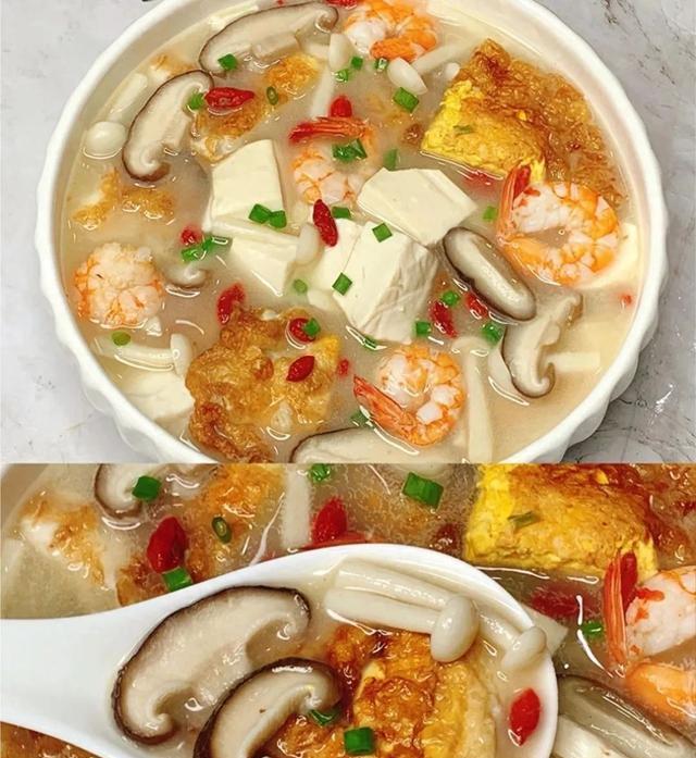 材料:鸡蛋两个,鲜虾10只,白玉菇100克,香菇100克,嫩豆腐1块,盐适量,胡椒粉适量。