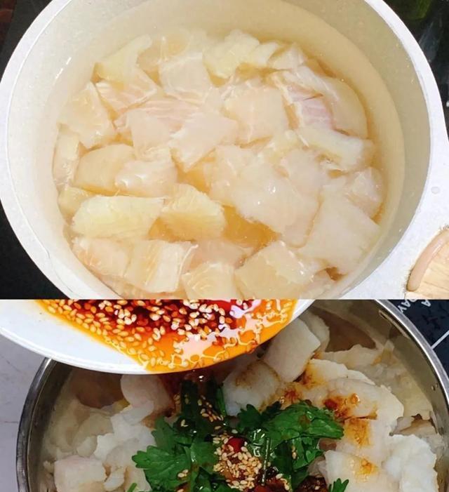 巴沙鱼切块放入生姜片,料酒,煮熟过零冷水,然后控水捞出,加入香菜料汁搅拌均匀即可。