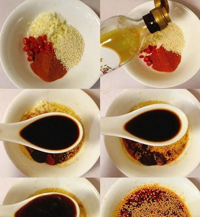 碗中放入小米辣、辣椒面、大蒜末、芝麻、倒入滚烫的热油,再调入2勺生抽,一勺陈醋,一勺蚝油,2勺凉白开搅拌均匀即可。