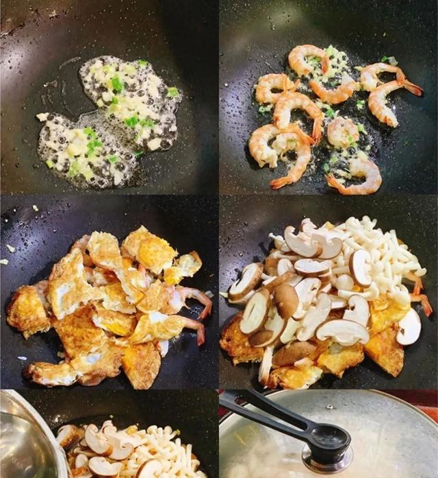 起锅热油把鸡蛋煎熟捞出切块备用。锅中留底油炒香蒜葱,倒入虾仁煎至变色,放入鸡蛋,香菇,白玉菇,加入没过食材的水,盖上锅盖焖煮8分钟。