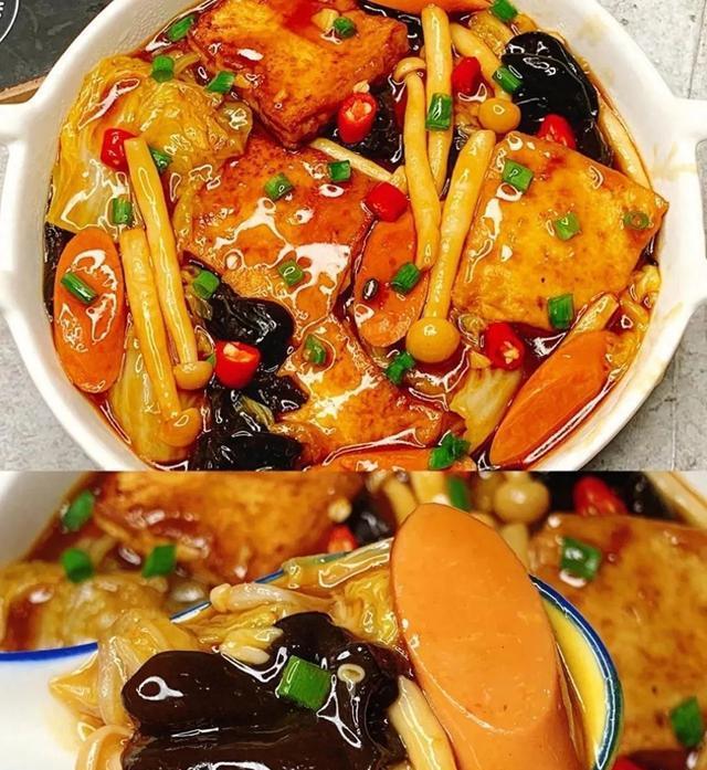材料:老豆腐一块,海鲜菇一把,娃娃菜一颗,木耳10朵,火腿肠1根,蒜葱适量,生抽,老抽,蚝油。