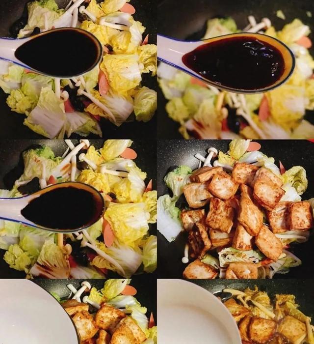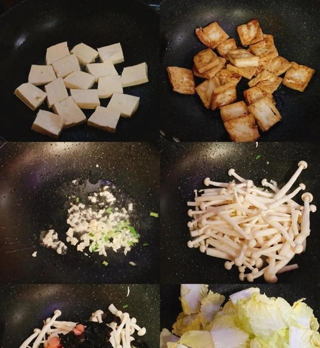 准备好食材,豆腐切块下锅煎至两面金黄盛出。锅里留底油爆香葱蒜,放入海鲜菇炒出水,加入木耳,火腿肠,白菜翻炒炒软。