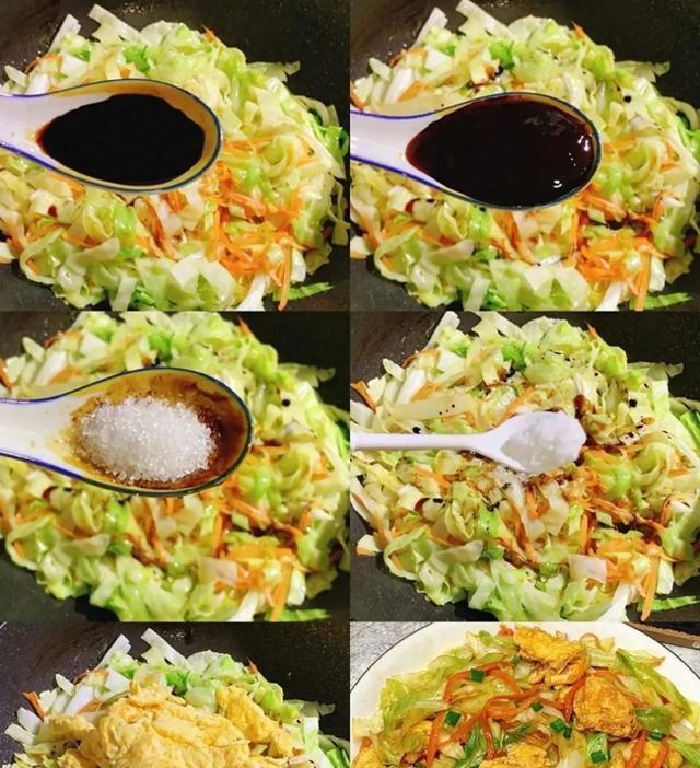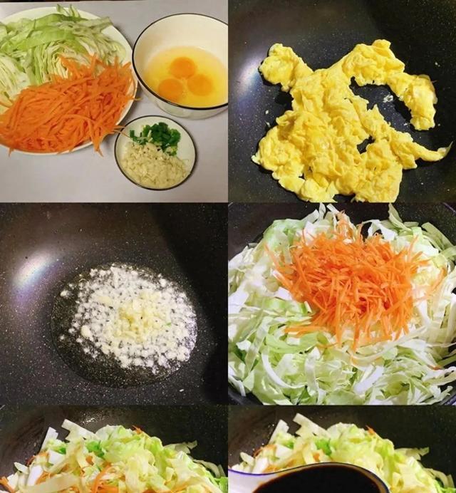 材料:鸡蛋2个,包菜半个,胡萝卜适量,生抽1勺,盐适量,老抽,蚝油,白糖5克。