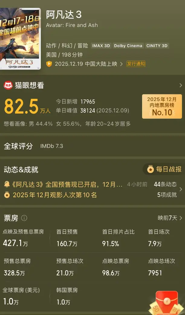 在元旦档期之前,还有一部引进片,在全球范围内的热度更大,那就是卡梅隆执导的电影《阿凡达3》。