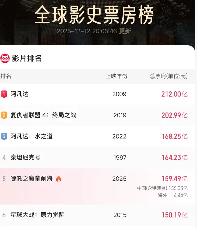 先来看看前两部电影的票房吧,目前的全球影史票房榜上,《阿凡达》是第一名,《阿凡达2》排在第三名,而《哪吒2》排在第五。