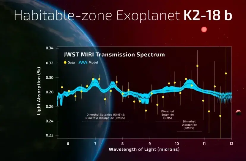 真正让科学家沸腾的,是韦伯望远镜捕捉到的大气光谱信号。研究团队用“凌星光谱法”观测,当K2-18b从主恒星前方经过时,恒星的光线会穿过它的大气层,就像紫外线照纸币显水印一样,光谱上会留下大气成分的“化学指纹”。通过分析这些指纹,科学家发现行星大气里不仅有甲烷、二氧化碳,还有两种关键物质——二甲基硫醚和二甲基二硫醚。在地球上,前者几乎全是海洋浮游生物产生的,海边闻到的腥甜气息就来自它,后者则是细菌、植物等生命活动的产物,这两种物质同时出现,简直是外星生命存在的“强暗号”。