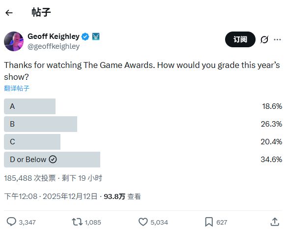 TGA2025颁奖典礼结束后,主持人杰夫·基斯利在社交平台X上发起投票,邀请玩家对本届盛典进行评价。投票结果呈现一边倒的趋势——超过34.6%的参与者给出了最低的“D”评价,而给予最高“A”评价的玩家仅占18.6%。