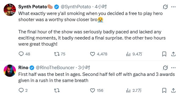 此次投票吸引了超过18万玩家参与,反映出社区对本届TGA的整体不满情绪。尽管《光与影:33号远征队》一举拿下包括年度最佳游戏在内的九项大奖成为最大赢家,但颁奖典礼的环节安排却引发了广泛批评。知名游戏博主Synth Potato与Rino在评论区直言:“你们究竟是怎么想的,居然觉得一款免费游玩的英雄射击游戏能成为压轴项目?整场典礼的最后一小时节奏完全乱套,根本没有任何能让人热血沸腾的高光时刻。”多位评论者指出,颁奖典礼的前半部分表现精彩,但最后一天的压轴安排和项目选择导致整体体验失衡。这与2024年TGA形成鲜明对比,当时近半数参与者给出了A级好评。