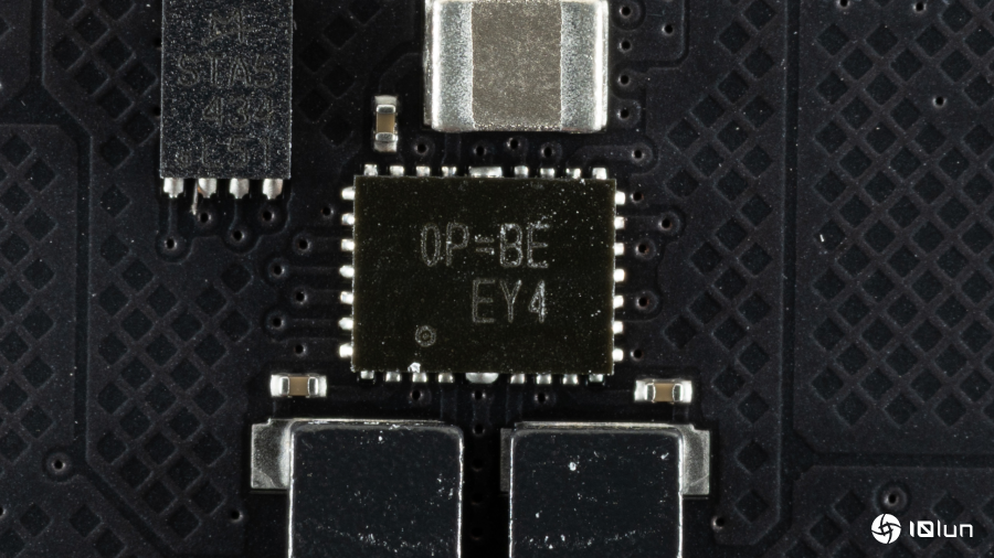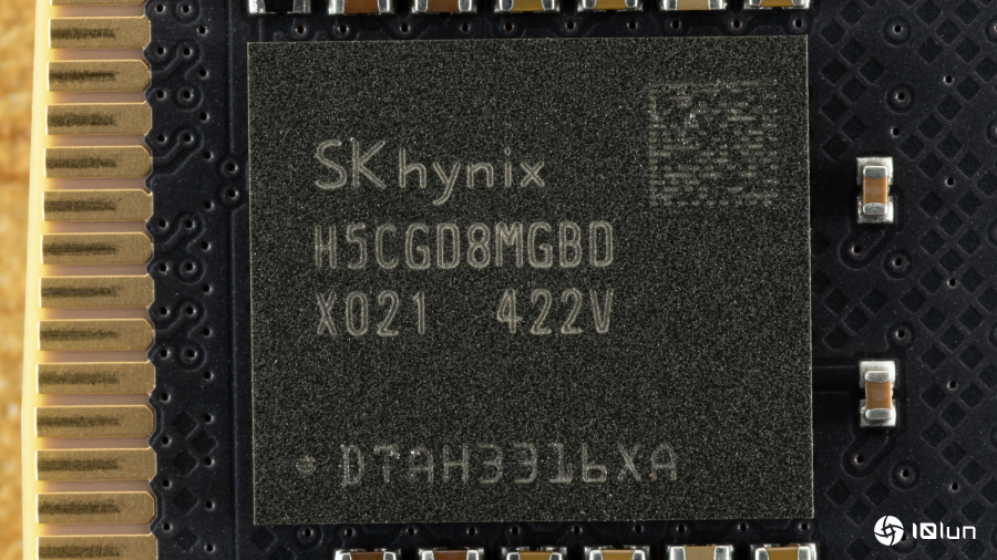 Biwin为黑曜石OC Lab金版DW100采用了10层PCB。除此之外,还在黑色PCB与铝合金散热片之间加入了导热系数为2.5 W/m·K的硅垫,以提升散热效率。集成电路 (IC) 来自三星 (SK hynix),型号为H5CGD8MGBDX021(M‑die),单颗容量3 GB,共计16块M‑die IC,左右各8块,采用双排 (dual‑rank) 排列。电源管理IC为Richtek生产的0P=BE EY4,是业界常用的元件。