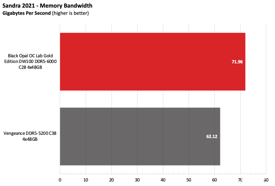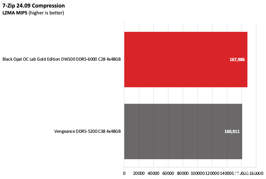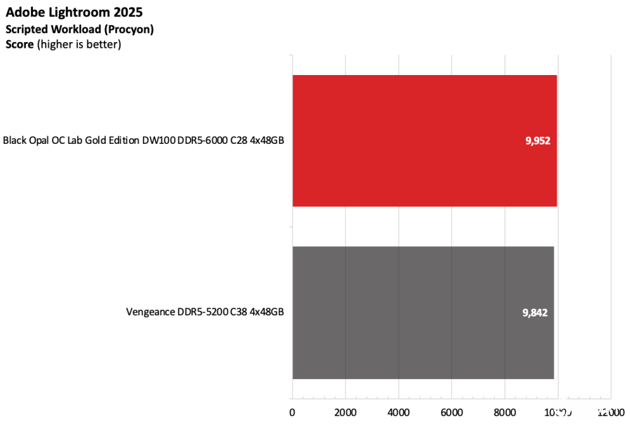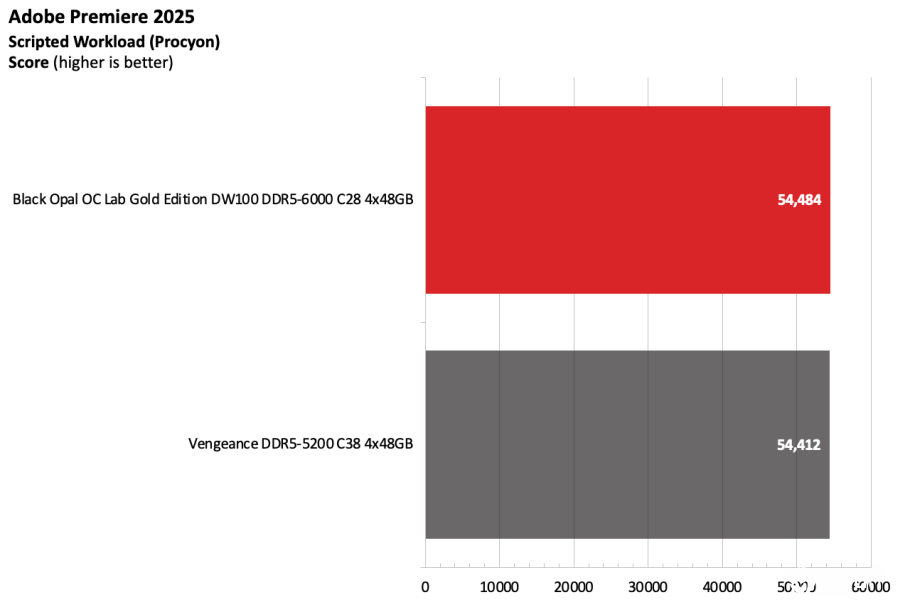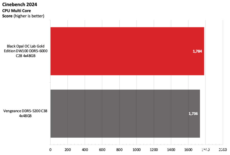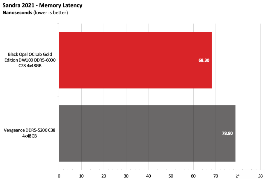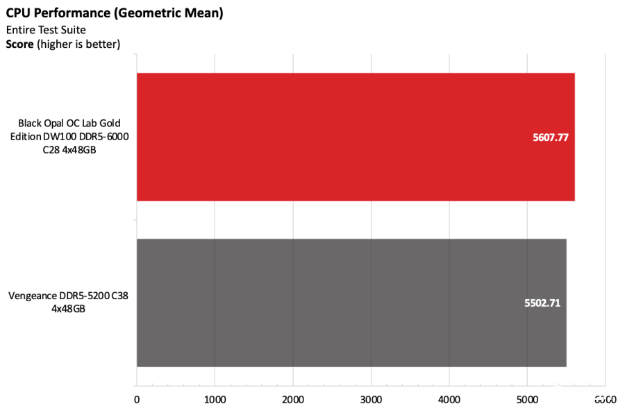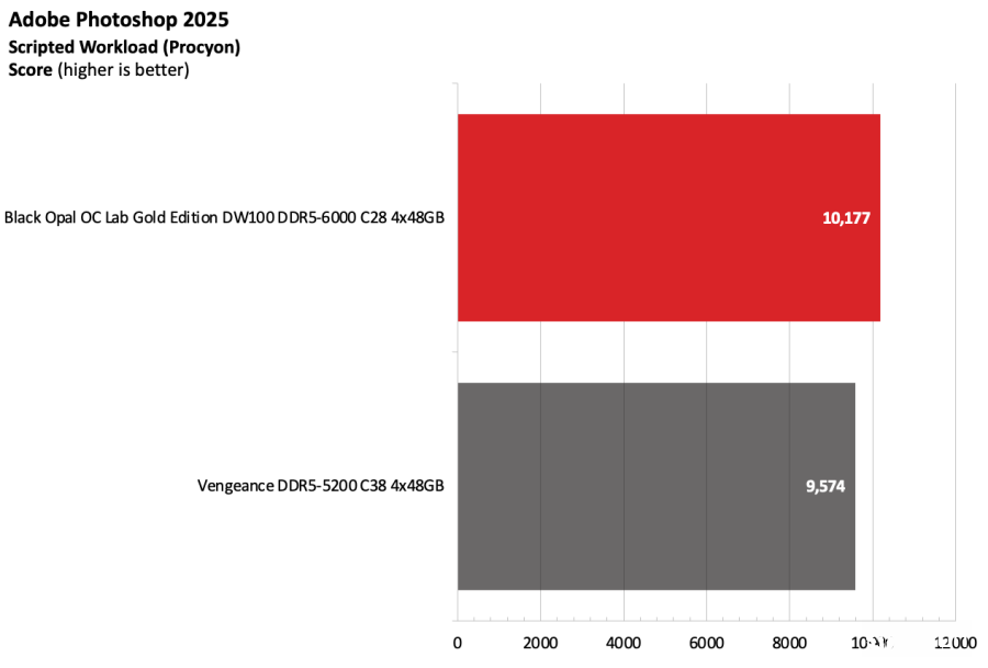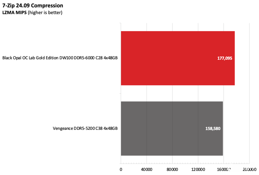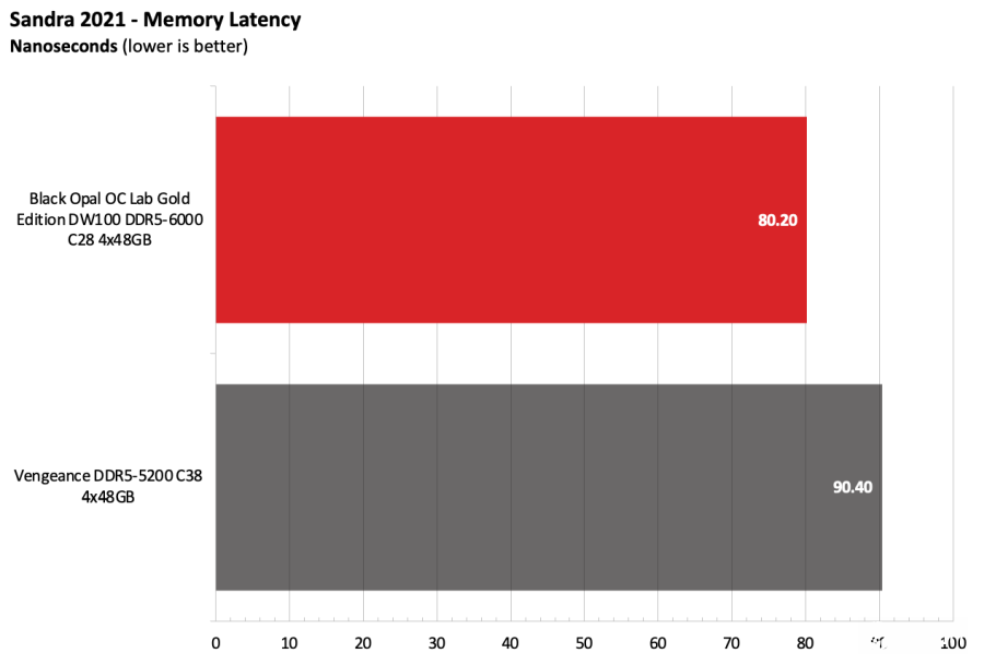 黑曜石OC Lab金版DW100在Intel测试平台上表现出色。该套件运行在DDR5-6000,作为主流配置已经相当稳健,并且凭借紧凑的时序在竞争者中脱颖而出。