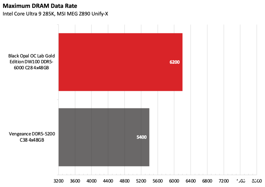 高容量内存套件的预期通常不高,然而黑曜石OC Lab金版DW100 DDR5-6000 C28通过将DRAM电压提升至1.45 V,便轻松跑出DDR5-6200,且时序保持与DDR5-6000相同,令人惊喜。
