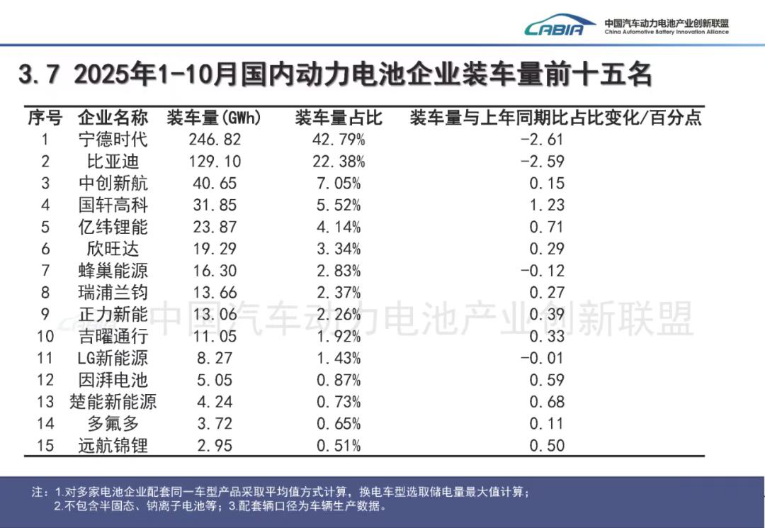 根据中国汽车动力电池产业创新联盟数据,今年1-10月,宁德时代动力电池装车量达246.82GWh,装车量占比为42.79%,较去年同期下降2.61个百分点。