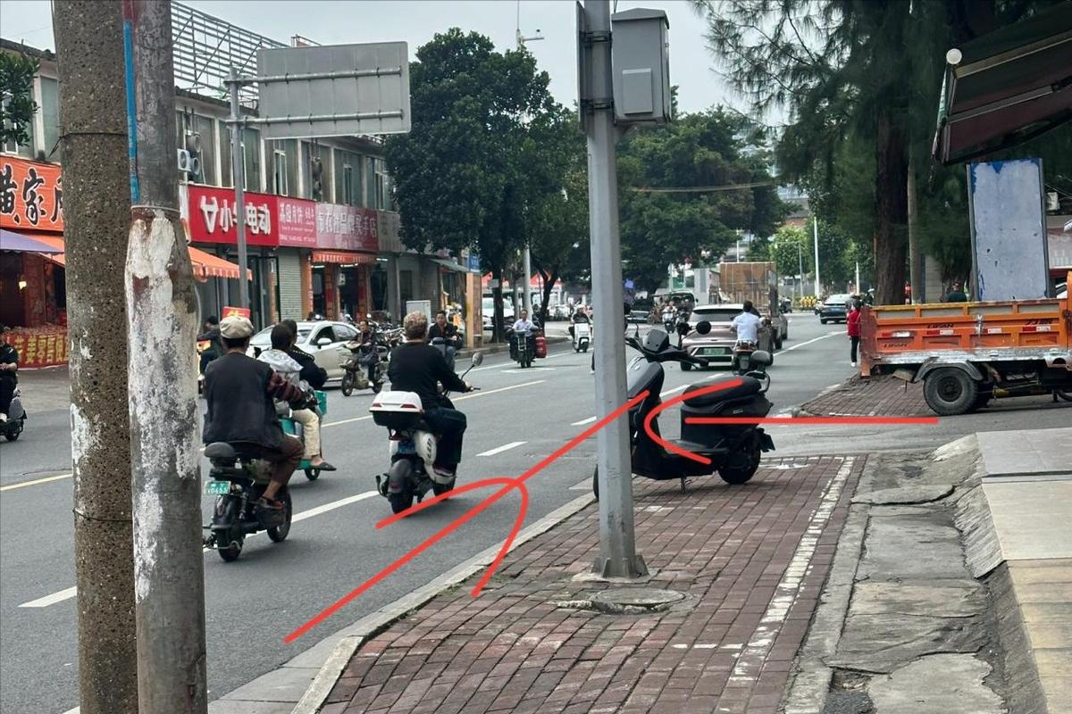 我需要从左边的箭头方向出来,但路上会有很多人骑电瓶车需要从我的车头前面经过。