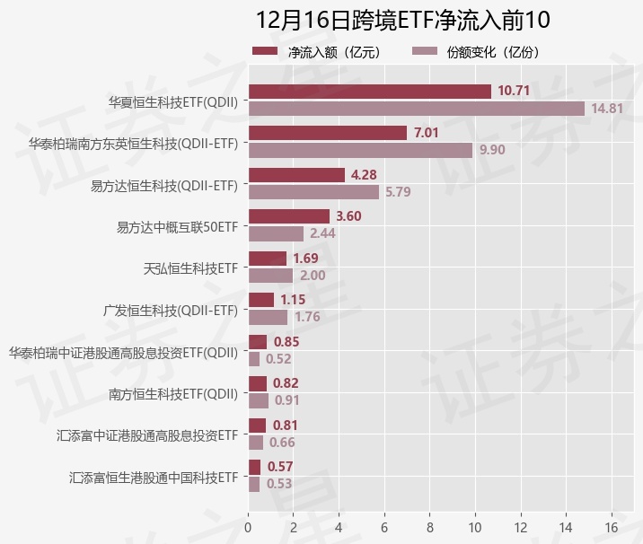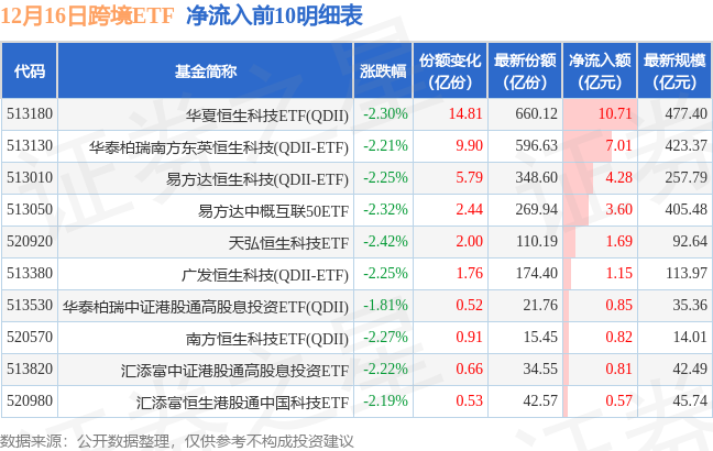 当日有50只跨境ETF基金出现资金净流入,其中净流入排首位的是华夏恒生科技ETF(QDII)(513180),份额增加了14.81亿份,净流入额为10.71亿元。