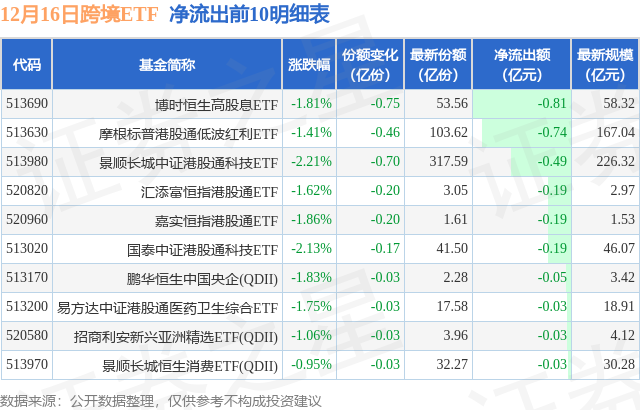 当日有15只跨境ETF基金出现资金净流出,其中净流出排首位的是博时恒生高股息ETF(513690),份额减少了7500.0万份,净流出额为8128.84万元。