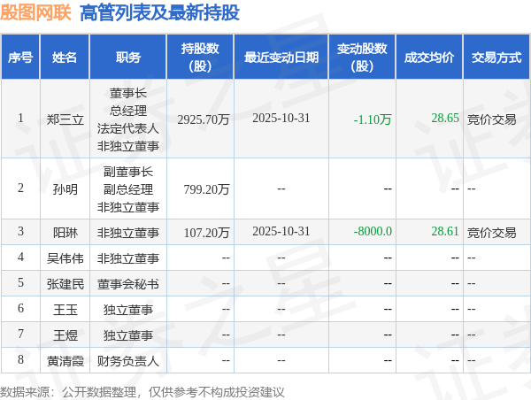 证券之星消息,根据12月17日市场公开信息、上市公司公告及交易所披露数据整理,殷图网联(920508)最新董监高及相关人员股份变动情况:2025年12月16日公司董事,高级管理人员郑三立、董事,高级管理人员孙明、董事阳琳共减持公司股份5.6万股,占公司总股本为0.0933%。变动期间公司股价上涨4.3%,12月16日当日收盘报26.44元。