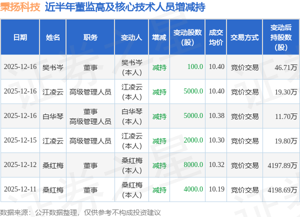 秉扬科技近半年内的董监高及核心技术人员增减持详情如下: