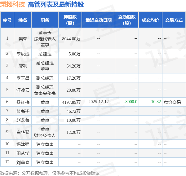 证券之星消息,根据12月17日市场公开信息、上市公司公告及交易所披露数据整理,秉扬科技(920675)最新董监高及相关人员股份变动情况:2025年12月15日至2025年12月16日公司高级管理人员江凌云、董事樊书岑、董事,高级管理人员白华琴共减持公司股份1.21万股,占公司总股本为0.0071%。变动期间公司股价上涨1.67%,12月16日当日收盘报10.37元。