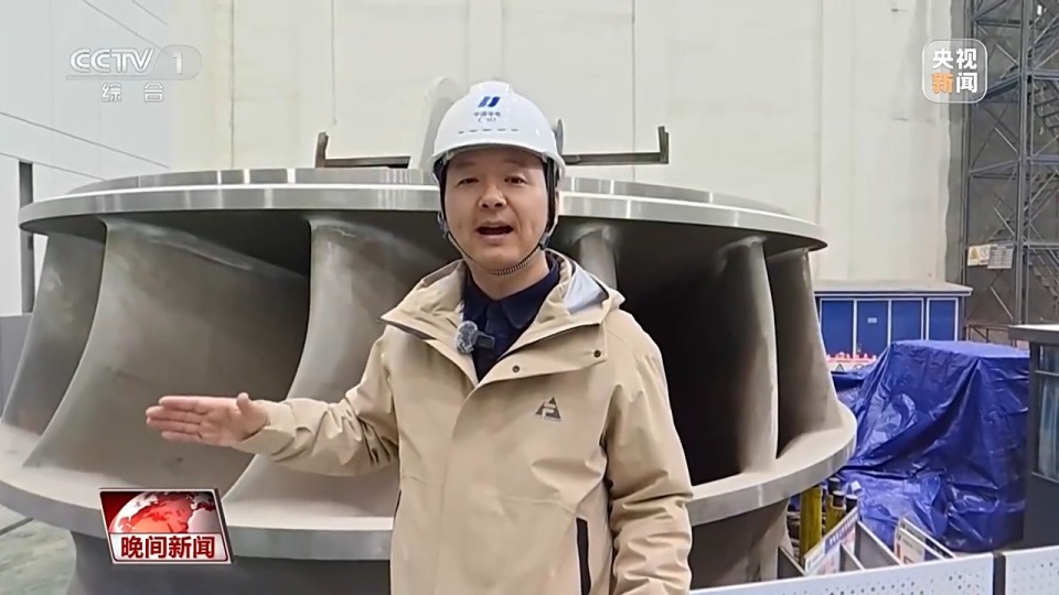 水电站究竟是如何发电的?记者身后就是发电机组最关键部件之一的转轮,澎湃的高压水流从190米的高处冲击下来,推动转轮高速旋转。它1分钟通过的水量近2万立方米,能够灌满大概8个标准游泳池,可满足超过4万个三口之家一年的用电需求。
