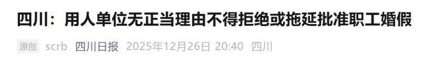 据媒体消息,12月26日,四川省人力资源和社会保障厅发出通知,要求各市(州)加大职工婚假规定执行力度,强调用人单位无正当理由不得拒绝或拖延批准职工婚假。