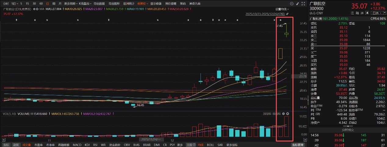 二级市场上,广联航空周四收盘20CM涨停,周五收盘涨超12%。