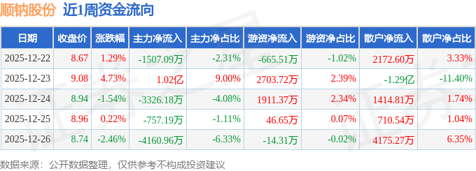 资金流向数据方面,本周顺钠股份主力资金合计净流入427.19万元,游资资金合计净流入3981.93万元,散户资金合计净流出4409.11万元。本周资金流向一览见下表: