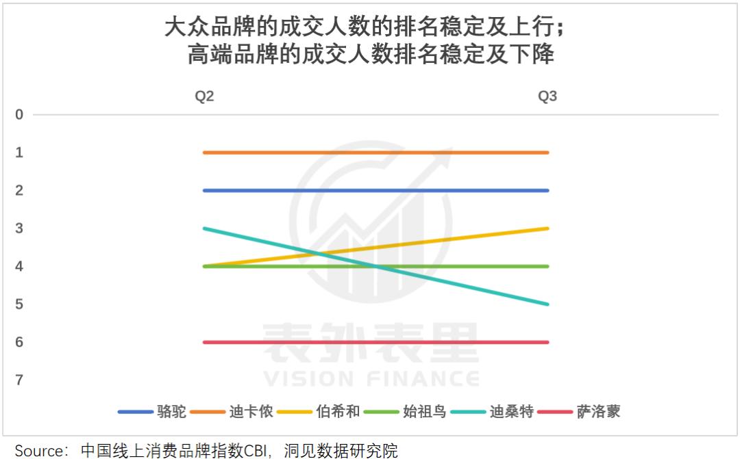 可以看到,户外运动品牌最新CBI指数的“成交人数”指标中,炙手可热的高端玩家排名下滑,骆驼等大众品牌排名稳居前列,伯希和的排名快速攀升。