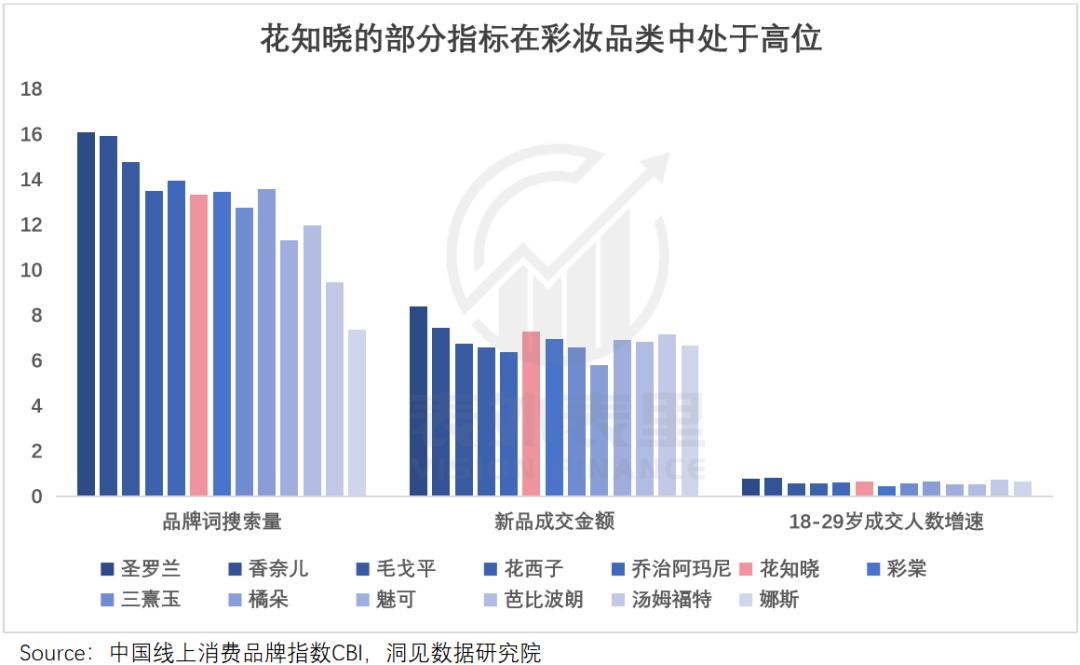 首次登上CBI500榜单的国货彩妆品牌花知晓也如此,其抓住“三坑”(汉服、JK、Lolita)人群高频装扮、热衷晒图的刚需,以草莓丘比特、蝴蝶云肩等“颜值即正义”产品,打出“国风少女彩妆”招牌,一举成为CBI名次上涨幅度最大的彩妆品牌。