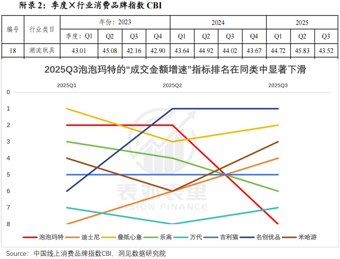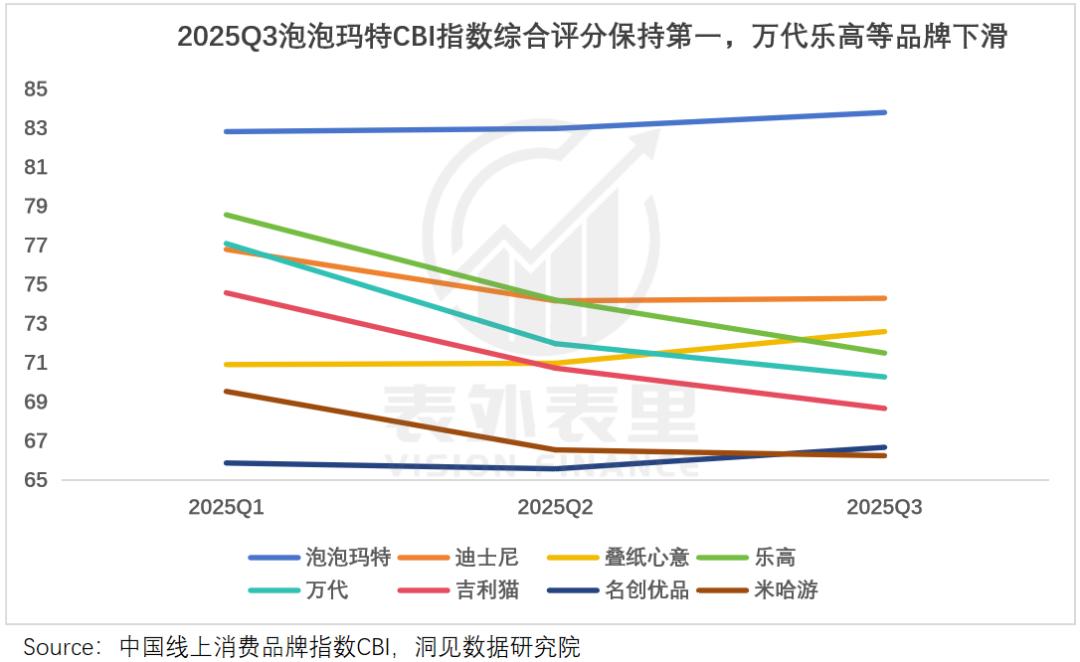 拆解CBI细节指标会发现,泡泡玛特仍稳坐行业“综合评分”第一,反而是乐高、万代等品牌排名下滑,拖着行业景气度下行。这说明,行业格局在进一步分化,利好泡泡玛特等头部品牌。