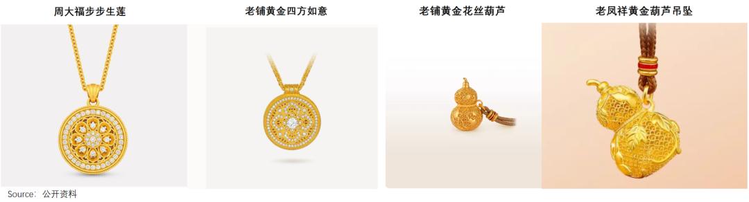 可以看到,周大福“传承”、老凤祥非遗花丝等系列,与老铺的产品仿佛异父异母的“亲姐妹”。
