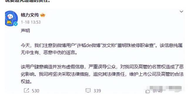 在相关谣言发酵不到半天的时间,格力就通过官方微博和证券交易所发布声明: