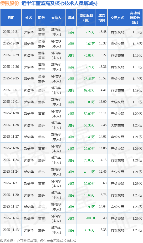 侨银股份近半年内的董监高及核心技术人员增减持详情如下: