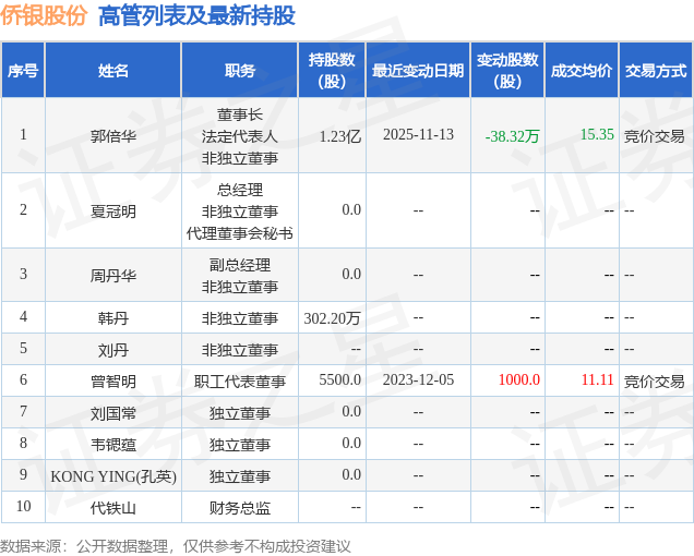 侨银股份的高管列表及最新持股情况如下: