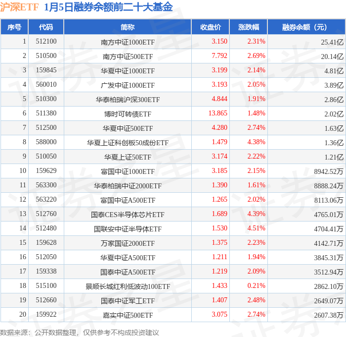 沪深ETF融券余额前三分别为:南方中证1000ETF(512100)融券余额25.41亿元、南方中证500ETF(510500)融券余额20.14亿元、华夏中证1000ETF(159845)融券余额4.81亿元,前20具体见下表: