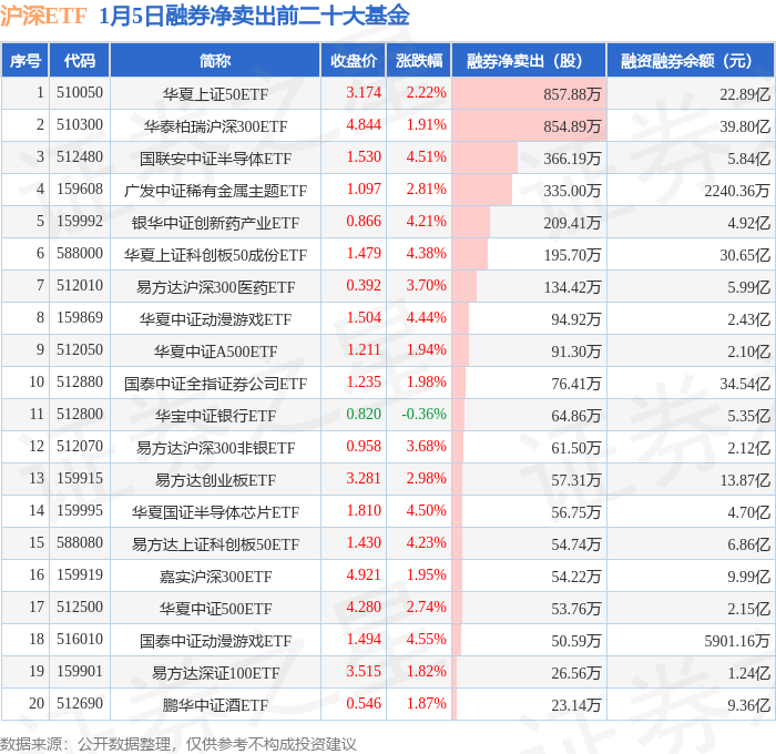 沪深ETF融券净卖出前三分别为:华夏上证50ETF(510050)融券净卖出857.88万股、华泰柏瑞沪深300ETF(510300)融券净卖出854.89万股、国联安中证半导体ETF(512480)融券净卖出366.19万股,前20具体见下表:
