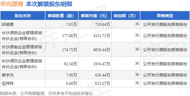 证券之星消息,根据市场公开信息整理,华光源海(920351)于1月7日将有455.5万股限售股份解禁,为公司公开发行原股东限售股份,占公司总股本5.17%。(本次数据根据历史公告整理得出,实际情况以上市公司最新公告为准)本次解禁后,公司还有4837.01万股限售股份,占总股本54.94%。具体如下图所示: