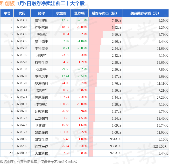 科创板融券净卖出前三分别为:信科移动(688387)融券净卖出7.49万股、广钢气体(688548)融券净卖出5.92万股、华润微(688396)融券净卖出3.1万股,前20具体见下表: