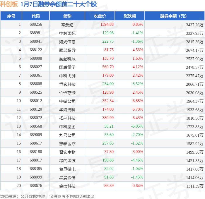科创板融券余额前三分别为:寒武纪(688256)融券余额3437.26万元、中芯国际(688981)融券余额3327.93万元、海光信息(688041)融券余额2815.36万元,前20具体见下表:
