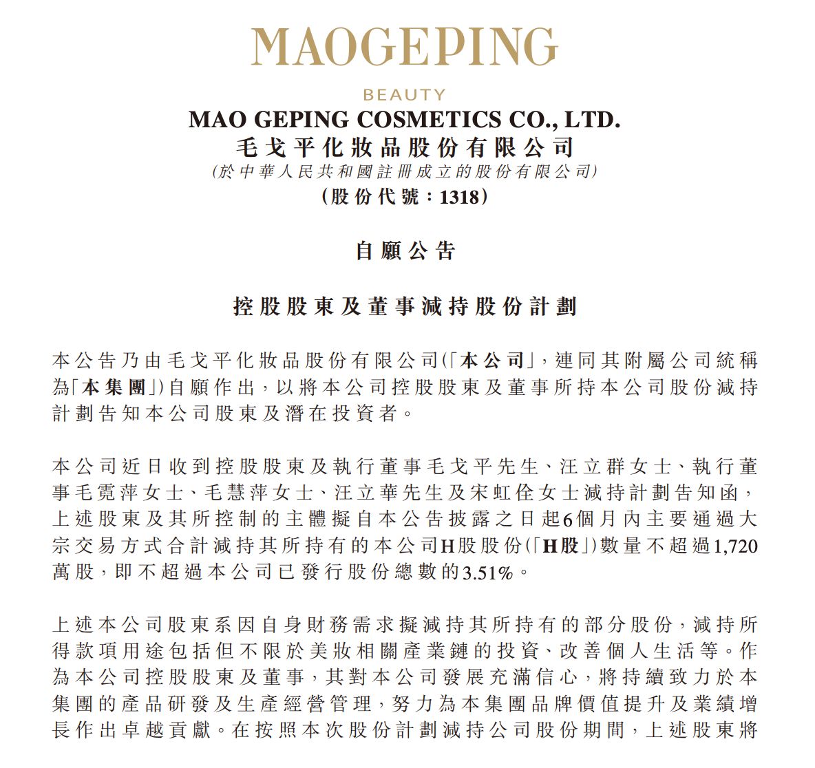 1月6日晚间,毛戈平股份发布公告称,公司控股股东及执行董事毛戈平、汪立群,以及毛霓萍、毛慧萍、汪立华、宋虹佺等多位家族成员,计划在未来6个月内通过大宗交易等方式合计减持公司不超过1720万股H股股份,占公司已发行股份总数的比例不超过3.51%。以当日公司82港元/股的收盘价计算,此次减持计划对应的套现金额约14.1亿港元。