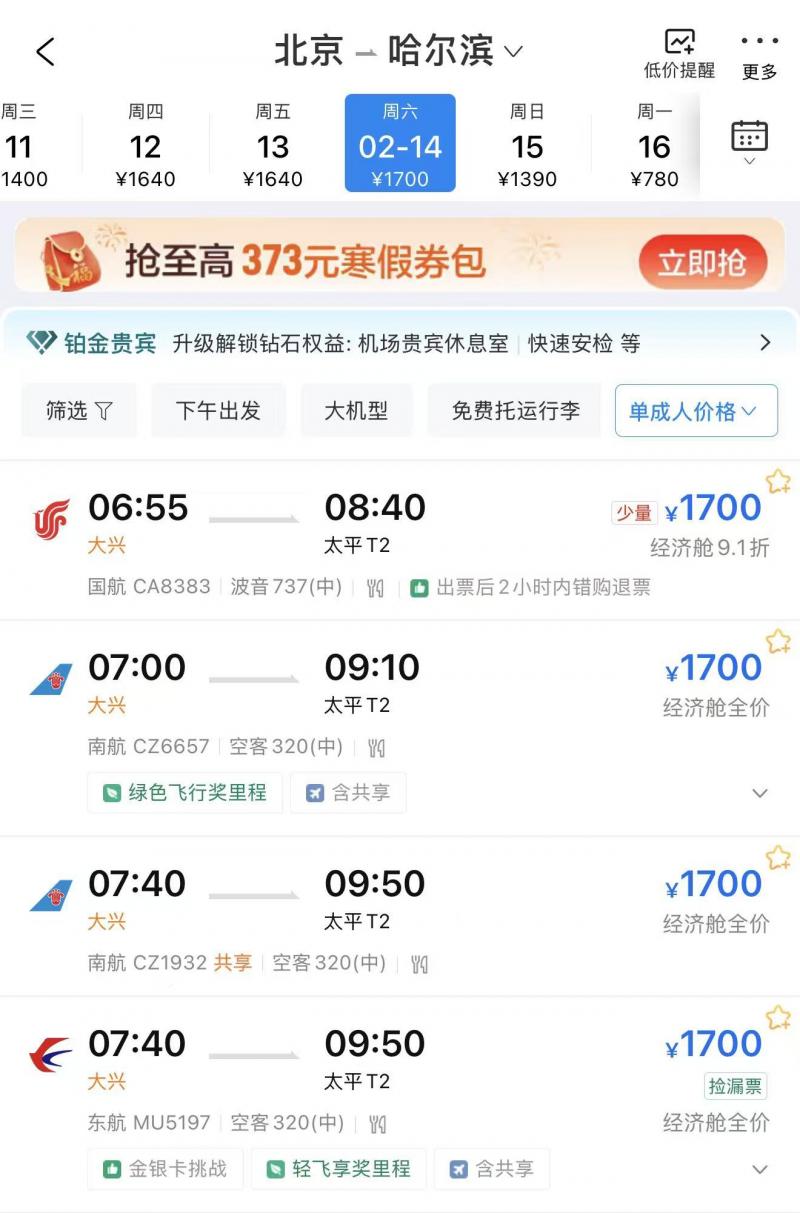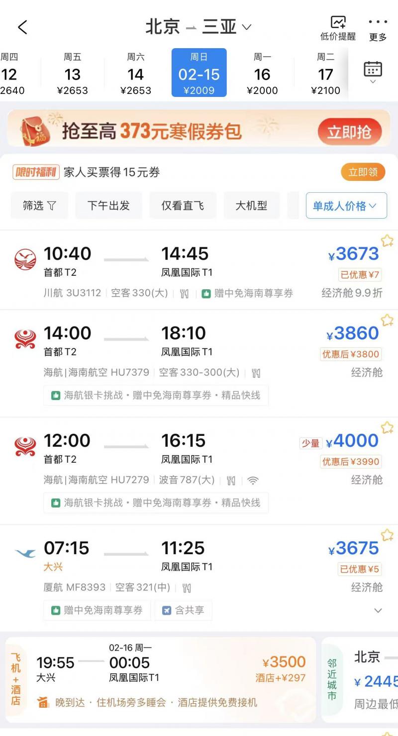 北青报记者在多家旅游在线平台搜索发现,2月14日、15日(除夕)从北京出发到三亚仍有经济舱全价票,而2月17日(初二)出发则有经济舱7折票。三亚到北京的回程2月23日(初七)还有大量经济舱全价票。