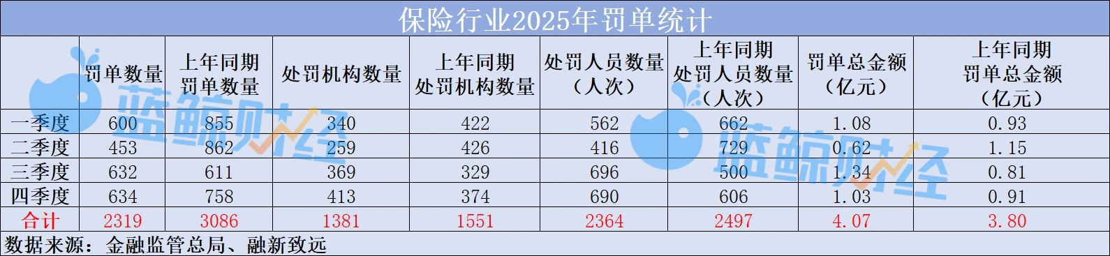 蓝鲸新闻记者根据公开数据不完全统计,2025年,监管针对保险业开出约2300张罚单,涉及保险公司及分支机构约1381家,责任人约2364人次,罚款总额累计约4.07亿元。对比2024年数据,罚单数量有所下降,但罚没总额大幅攀升。