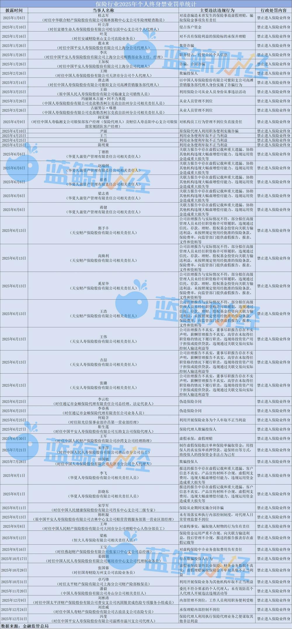 记者不完全统计,在对个人的处罚决定中,警告2268人次,罚款2239人次,处罚金额累计8376.35万元,取消任职资格共计21人次,禁止从事保险业共计119人次。其中不乏顶格处罚,至少49人被终身禁入保险行业。