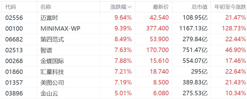 格隆汇1月12日|近日MiniMax、智谱等多家国产AI大模型公司集中在港上市,带动港股市场AI概念股集体走强,其中,迈富时、MINIMAX-WP涨超9%,第四范式涨超8%,智谱、金蝶国际、汇量科技、美图公司涨超7%,金山云涨5%。值得注意的是,MINIMAX-WP、智谱均创上市新高。